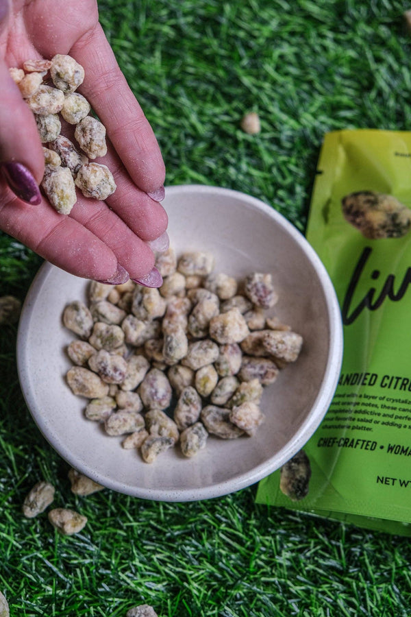 Citrus Candied Pistachios These zesty candied pistachios will quickly become your new favorite snack...move over candied pecans ..pistachios are the next IT nut. Coated with a crunchy layer of crystalized sugar infused with orange, these sweet candied pistachios are completely addictive and perfect for munching, topping your favorite salad or adding a special touch to a charcuterie platter. * Candied with premium ingredients * No corn syrup * Naturally Gluten Free * Vegan / dairy-free indulgence * No preservatives or artificial flavors * Handcrafted in small batches Ingredients Pistachios, Sugar, Orange Juice, Orange Zest, almond and orange extracts *Produced in a facility that uses milk, other tree nuts, wheat, peanuts and soy