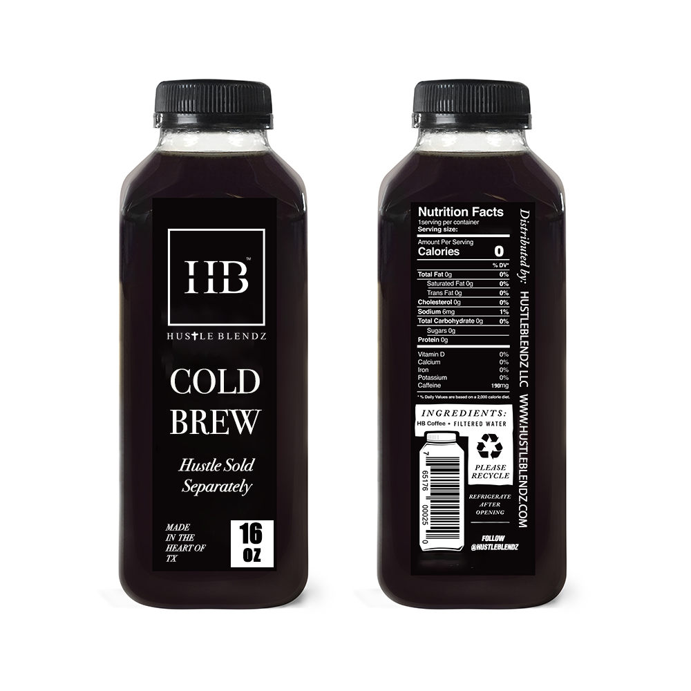 Our Hustleblendz Cold Brew, a single origin delicious cold brew, made with you in mind. 16oz In total Filtered Water Cold-pressed espresso from our single origin Colombian coffee 100% real, no dilution and no preservatives Cold Brew has a shelf life of 3 months. Refrigerate after opening Best to use within 2 weeks of opening